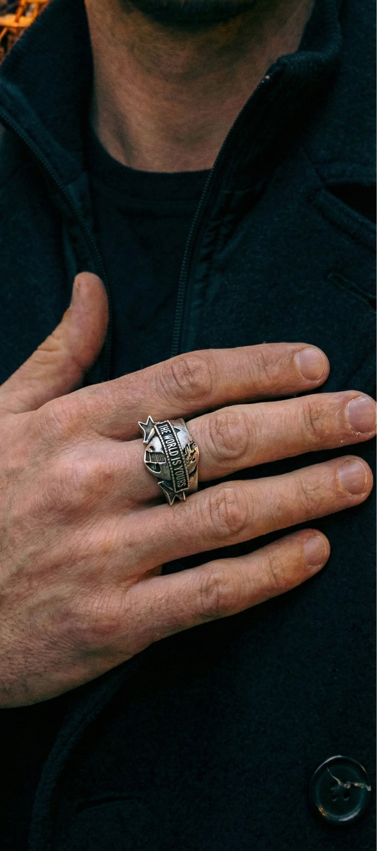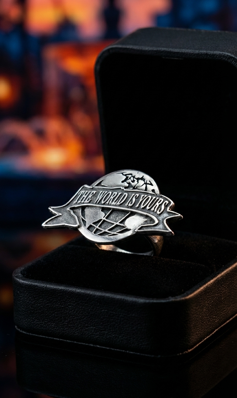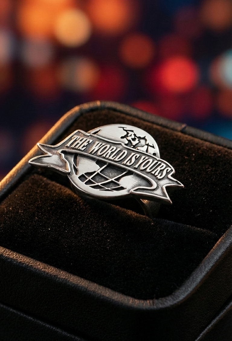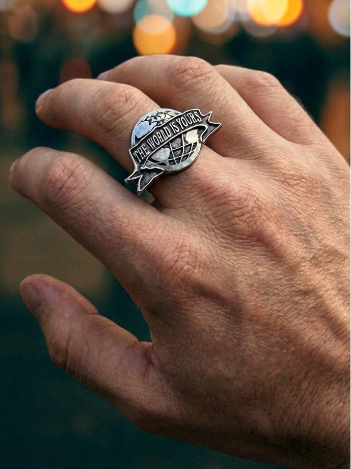 "El mundo es tuyo". Más que una frase, es una mentalidad. Este anillo captura la esencia de quienes no aceptan un "no" por respuesta. Inspirado en la estética clásica del poder y el éxito, el diseño presenta un globo terráqueo detallado envuelto en una cinta con el lema que ha marcado generaciones.